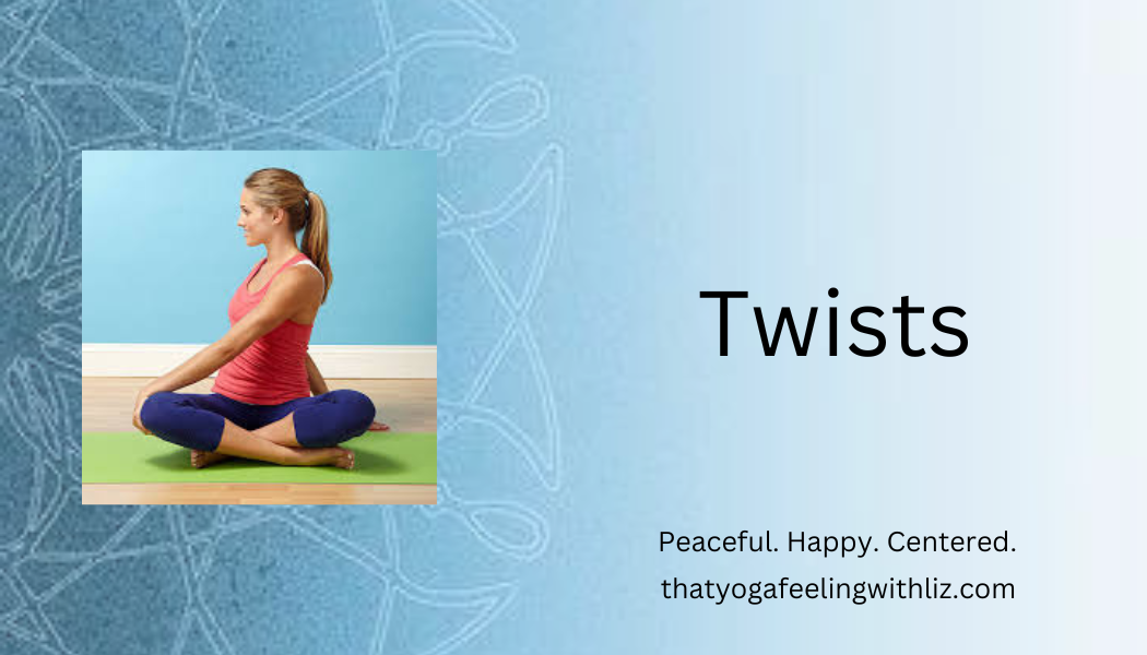 Twists can be practice seated, standing, or lying down. For any twist there needs to be an anchor. A part of the body that will remain stable while another part moves into the twist. For seated twists, the anchor is your pelvis and lumbar spine. The rotation starts at the waist and spirals up the spine. For a reclined twist, the shoulders are the anchor, and the pelvis moves as the knee(s) drop towards the floor. (See the pictures below.)